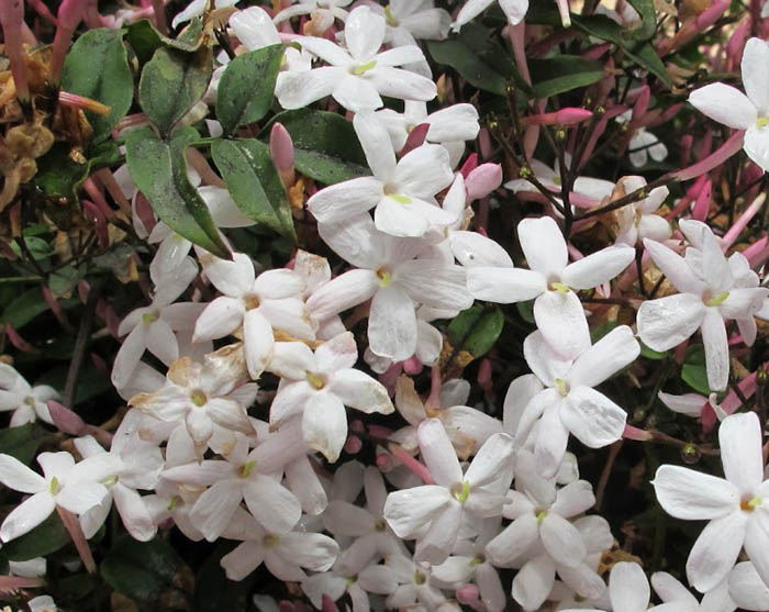 anche "gelsomino della Cina" (foto sotto) è un rampicante sempreverde, semirustico, ad accrescimento rapido che produce fiori di colore bianco-rosa, molto profumati che sbocciano in inverno.